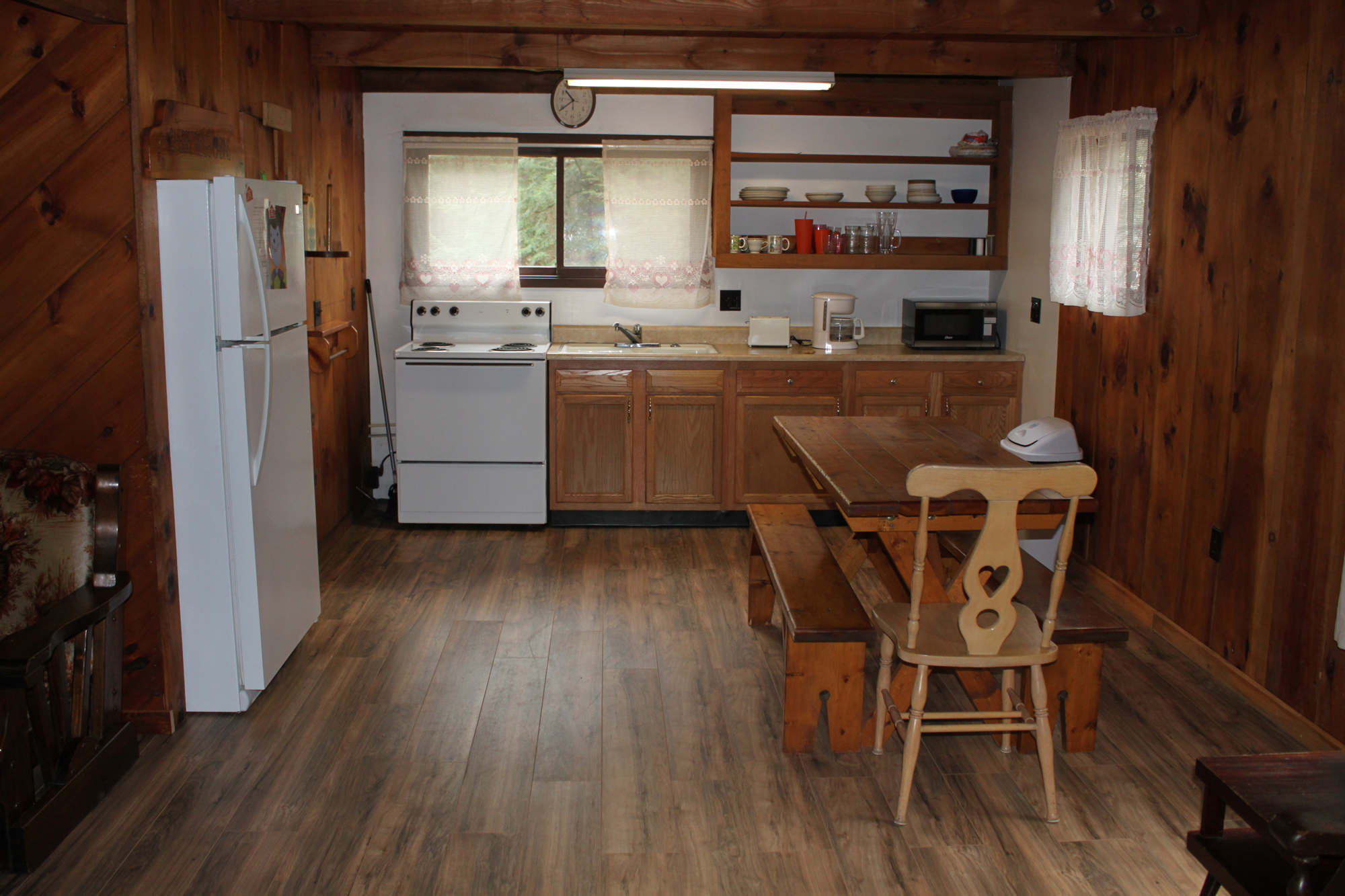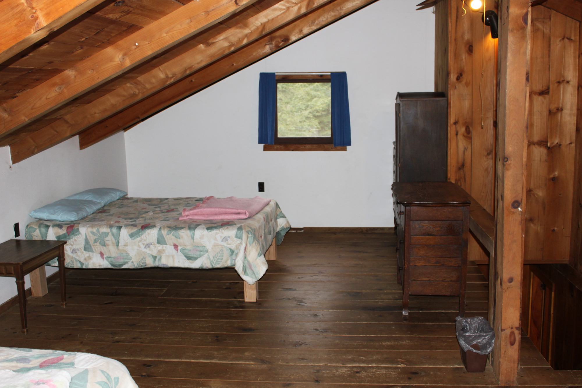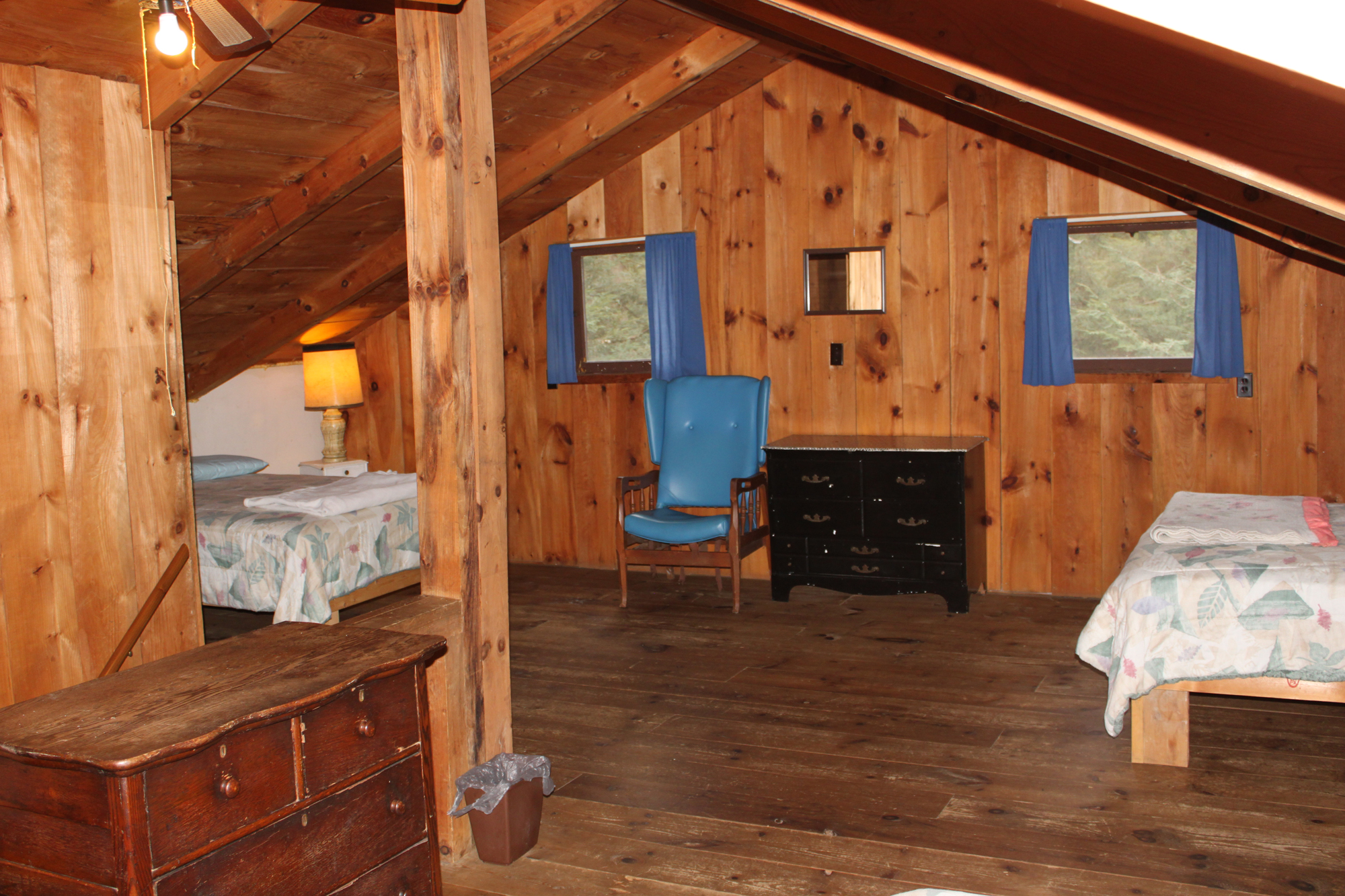 A small, two-story, 2-bedroom cabin with the kitchen, dining room, bathroom, and living room on the 1st floor and the bedrooms upstairs. It is a rustic cabin with wood floors, but offers all modern amenities. The upstairs has one large loft area with three full-sized beds and a private section of room (often referred to by our guests as “The Honey Moon Room”) with one full-size bed. Cabin is located at the end of a short lane with level wooded yard and gravel fire-ring.